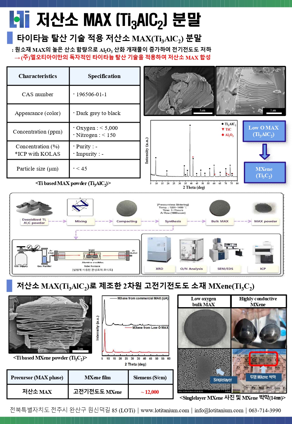 (주)엘오티아이 독자적인 탈산기술 적용 6,000ppm 이하 저산소 고상분율 MAX 분말을 제공합니다.